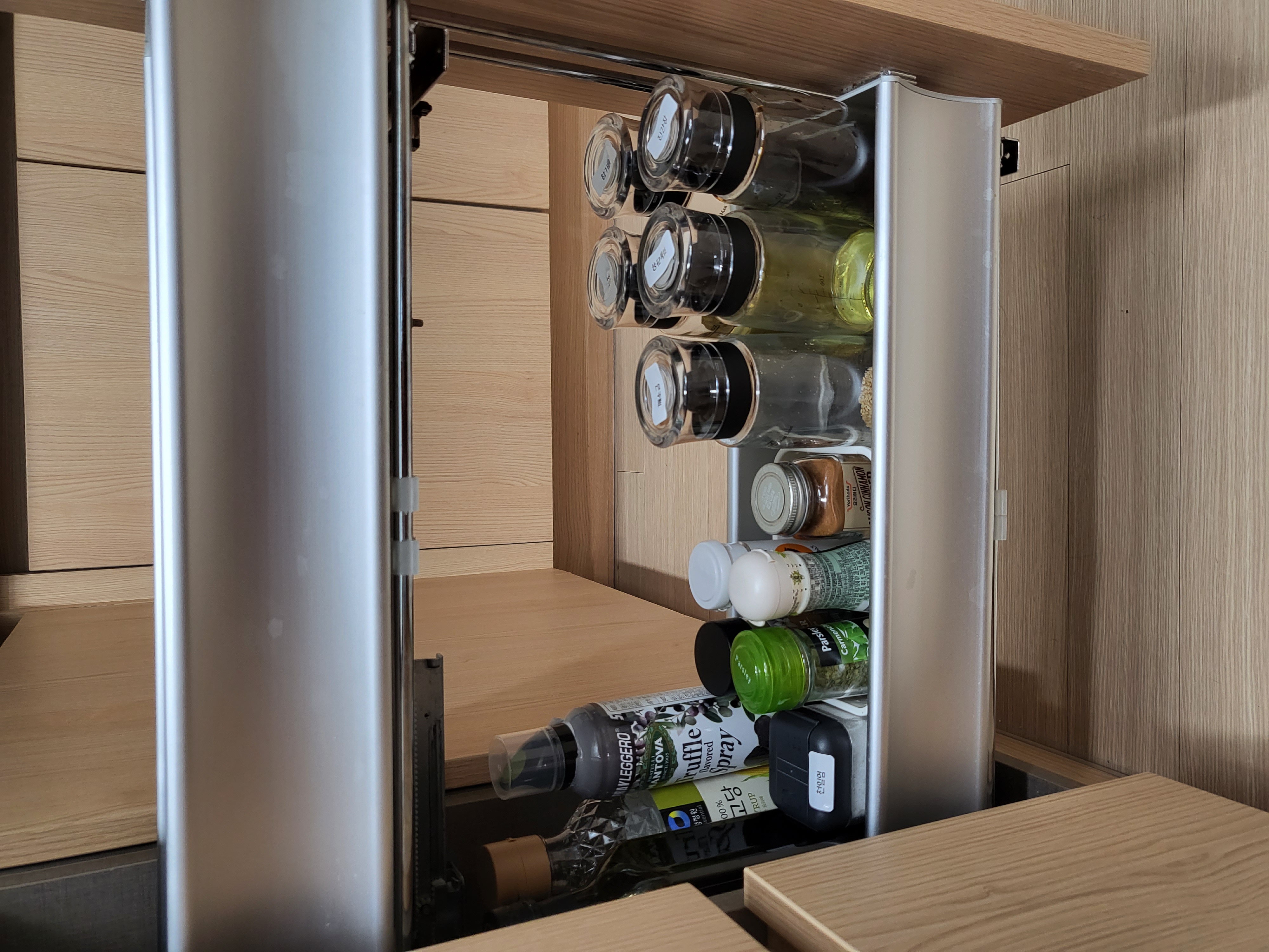 양념통 정리전엔 위칸 아래칸 다 꽉 차 있고 사이즈도 중구난방이었어요. 유통기한 확인하며 버릴거 버리고 최대한 일괄적으로 병 맞추고 작은건 작은거끼리 모아 놓으니, 더 깔끔해 보여서 기분 좋고 심지어 정리 후엔 위칸이 비었네요ㅎㅎㅎ