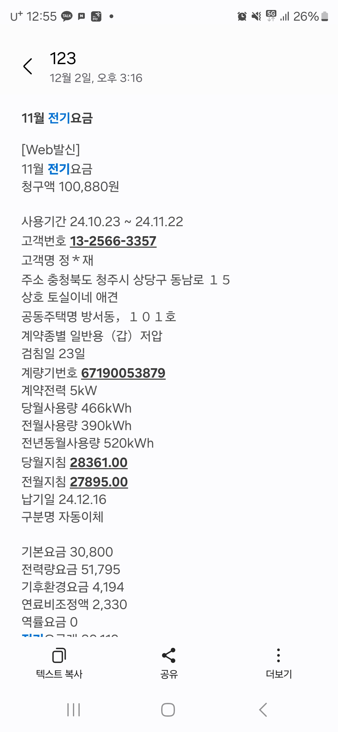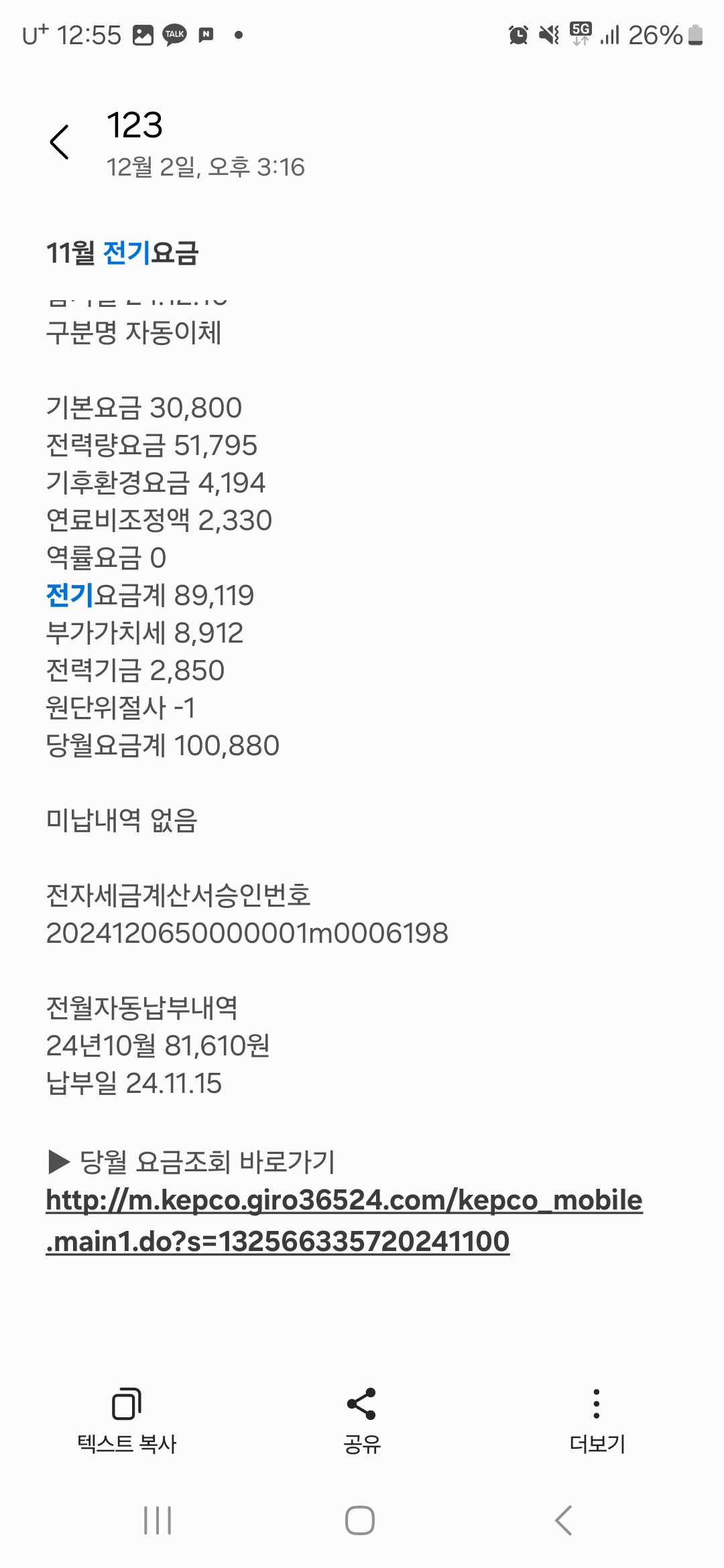 전기세 문자 고지서