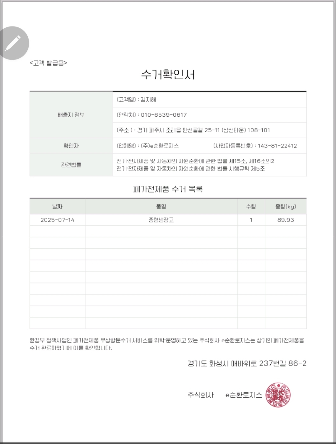 집에까지 올라오셔서 수거 해 주셔서 너무 감사합니다.