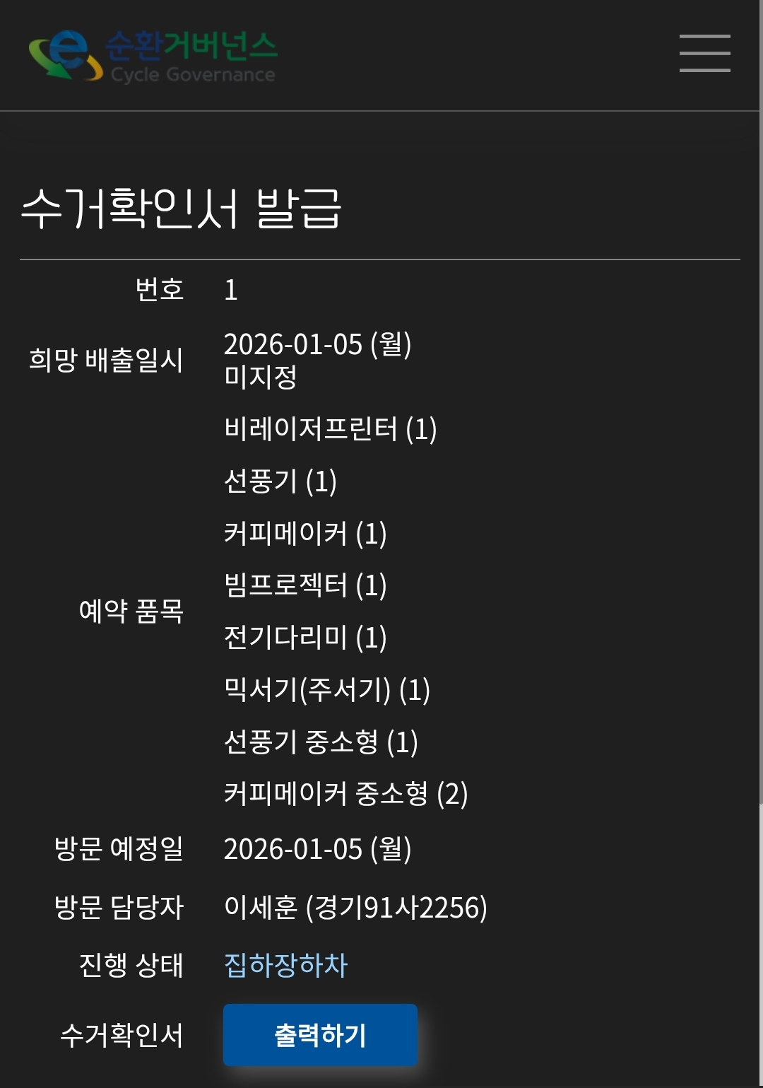 소형 전자 가전제품 첫 배출하였고 물품 품목이 몇개 바뀌었지만 이상없이 진행되었고 이 시스템에 만족합니다.