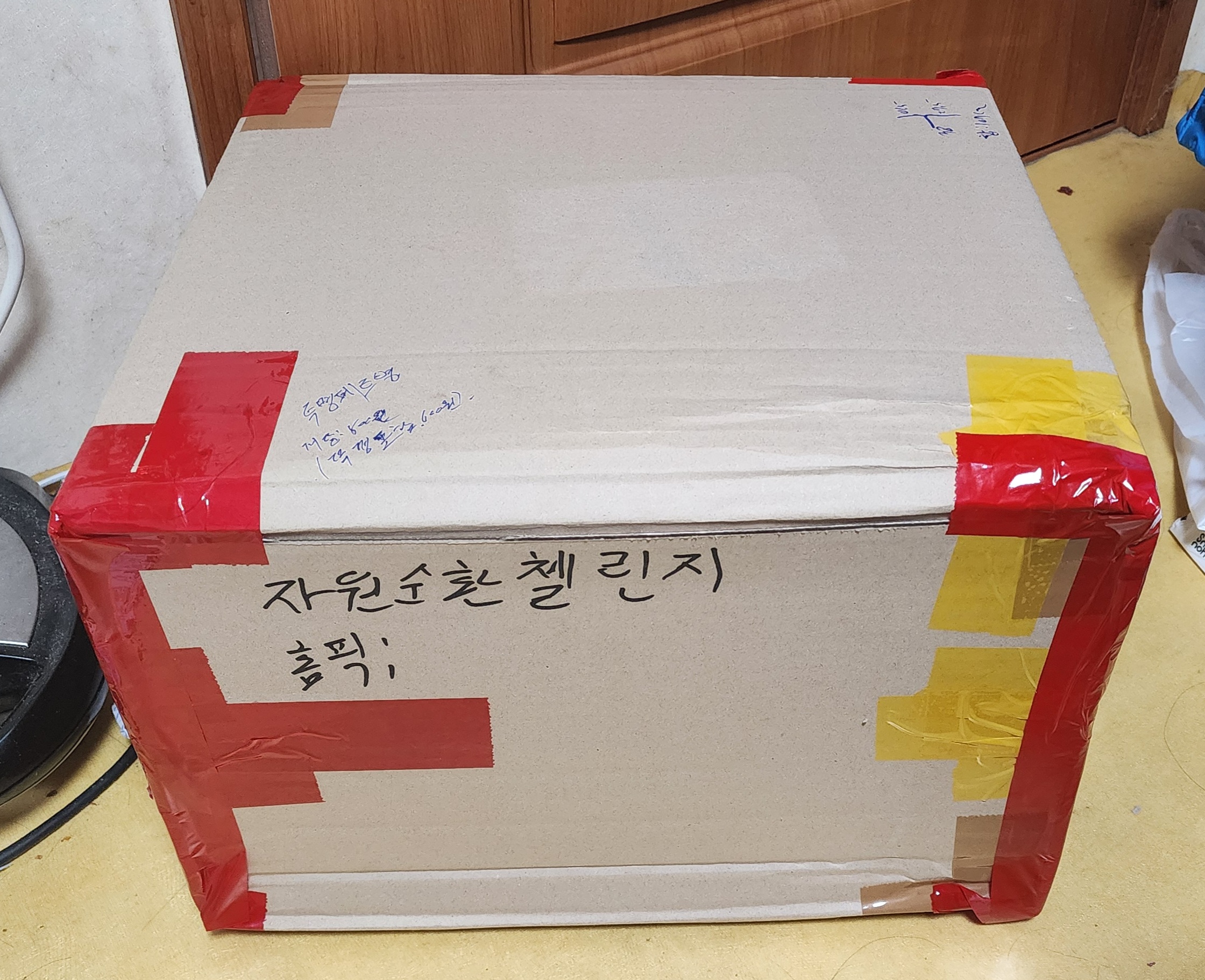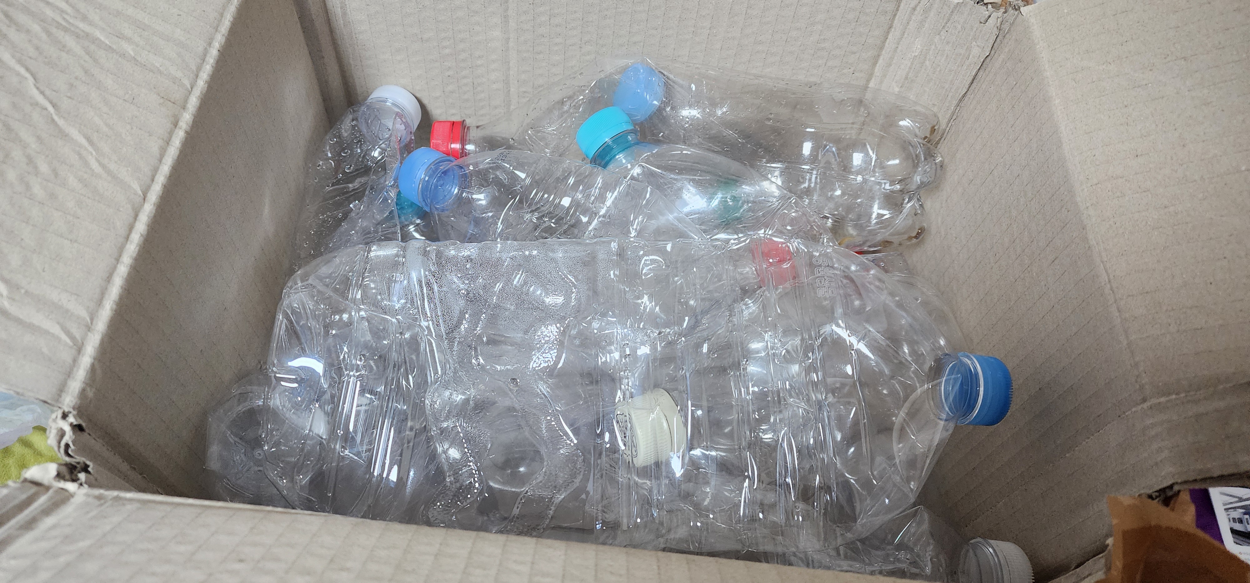 투명페트병 잇는  라벨는 제거하고 페트병을 모아셔 박스에 넣기 •••