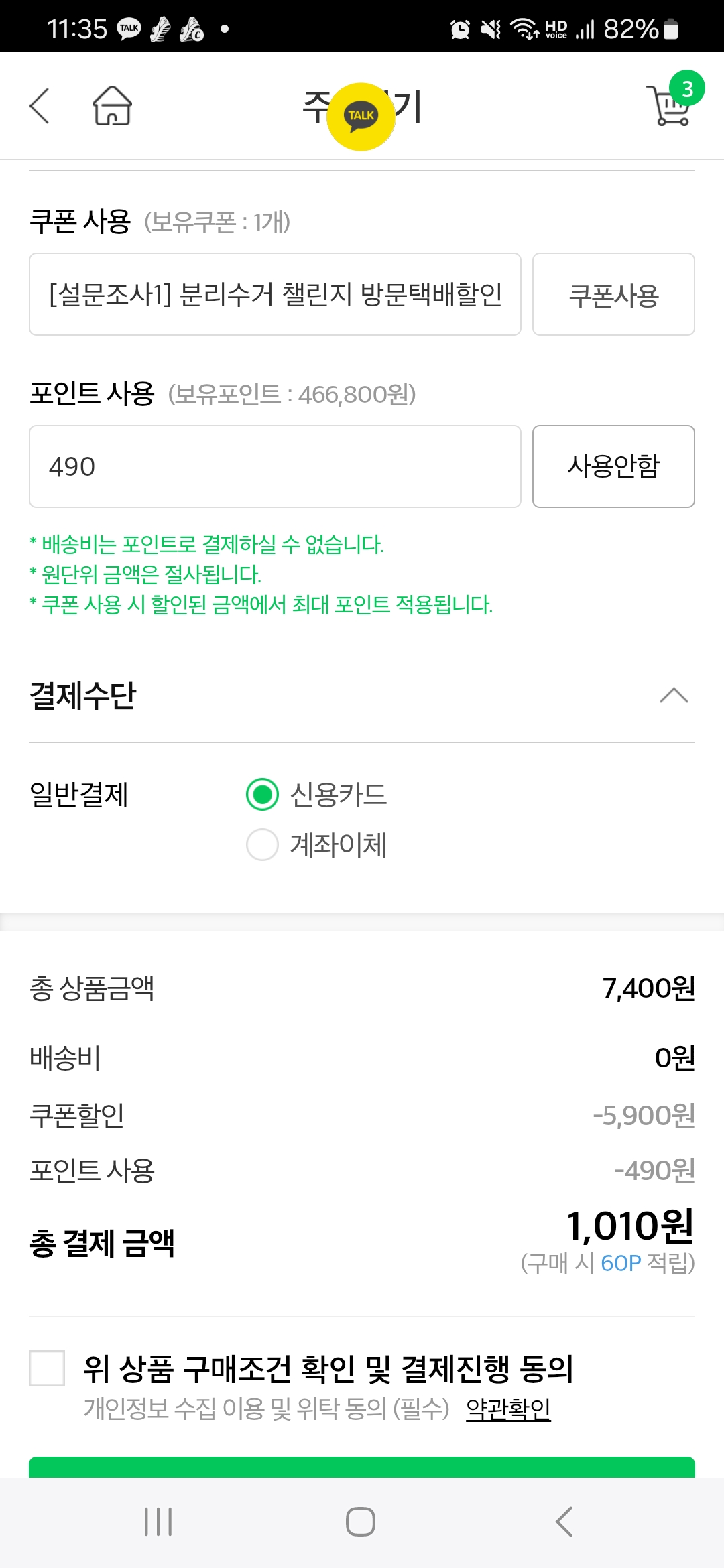 쿠폰과 포인트를 사용해서 1,010w로 보냈어요.