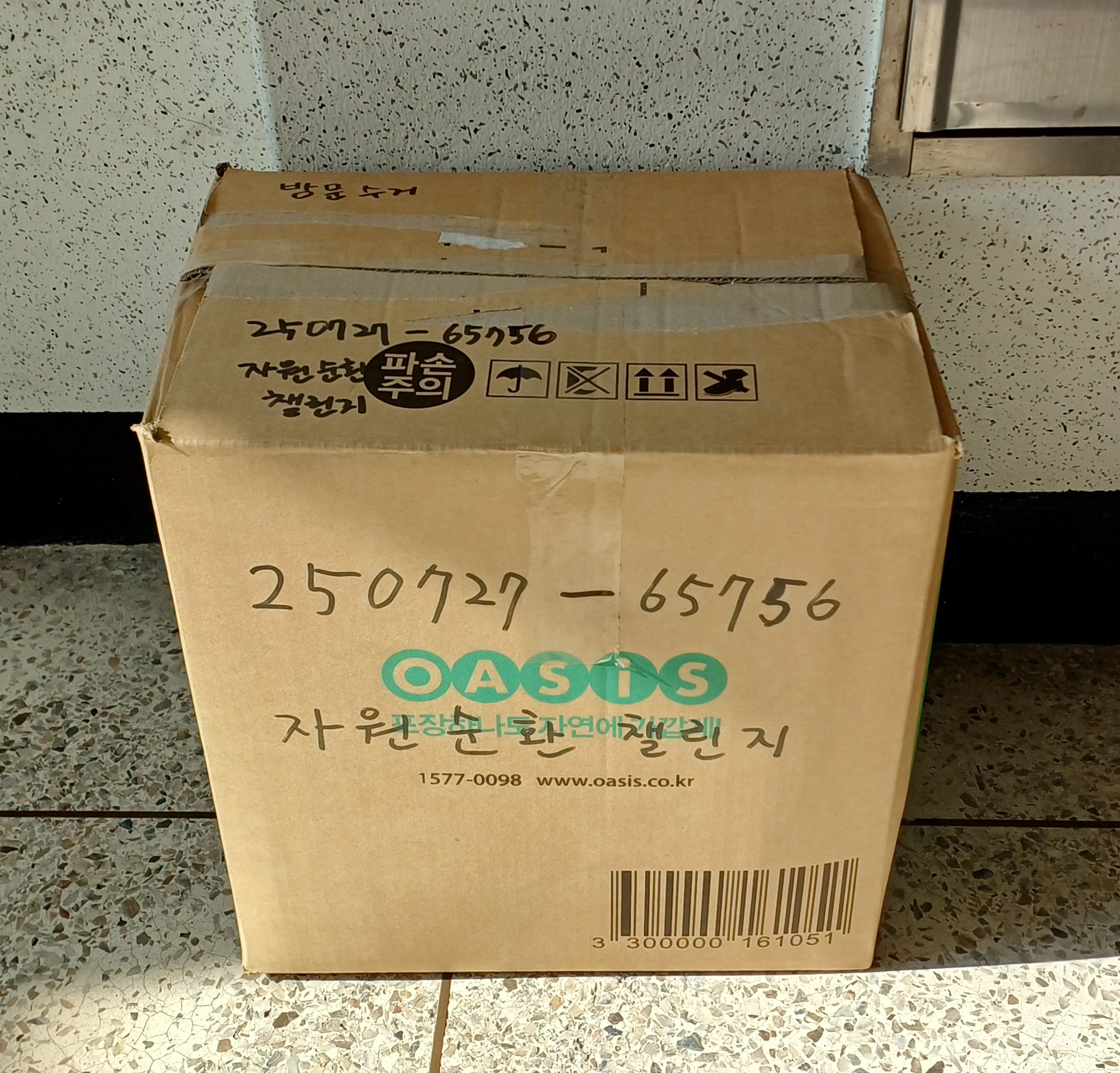 그동안 모아 둔 우유팩 250개 박스에 꾹꾹 눌러 담아 수거 신청했습니다.